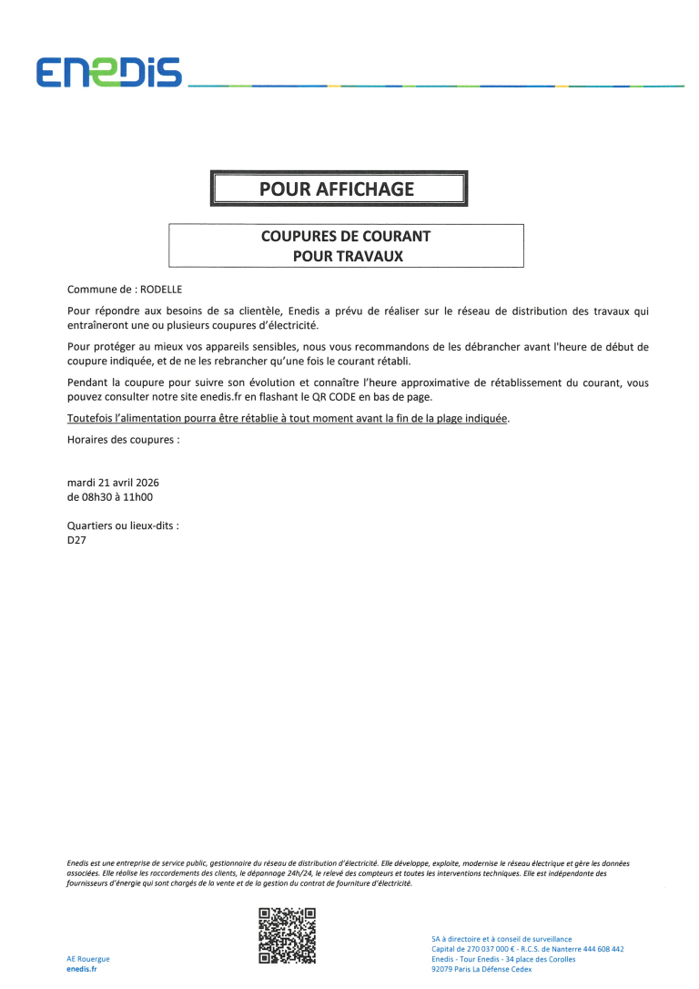 21 ET 23 AVRIL : COUPURE DE COURANT POUR TRAVAUX