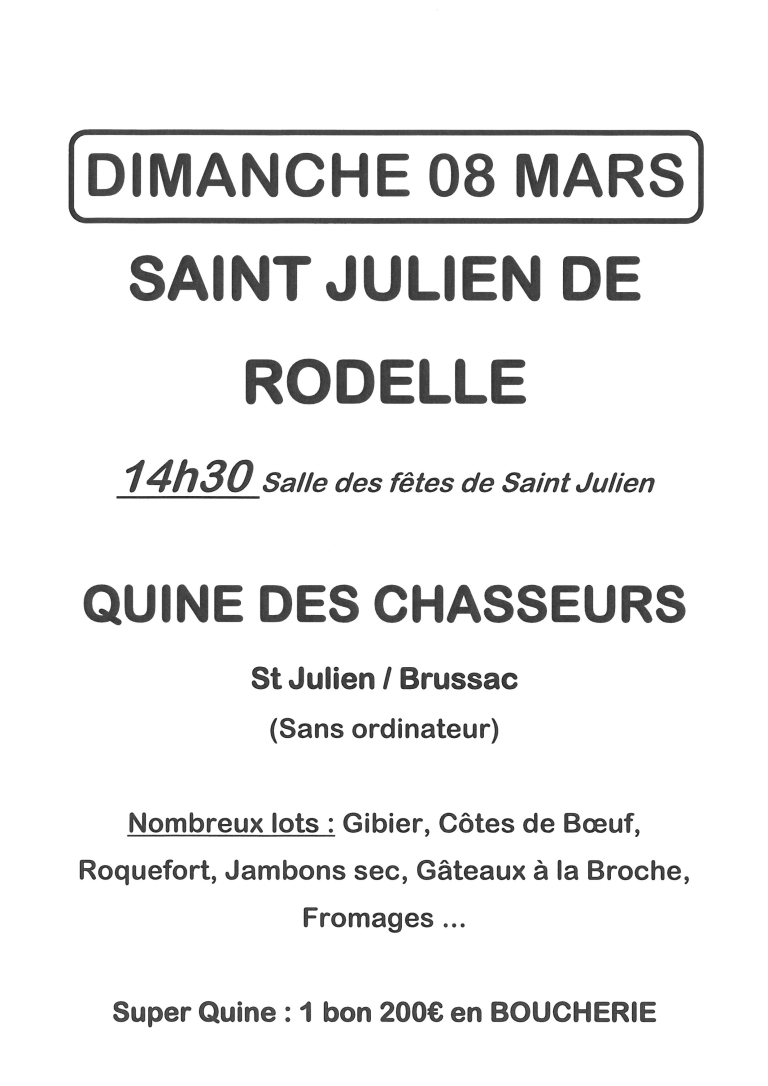 Quine sans ordinateur, organisé à la Salle des Fêtes de Saint Julien de Rodelle, le Dimanche 8 mars, à 14 heures 30.