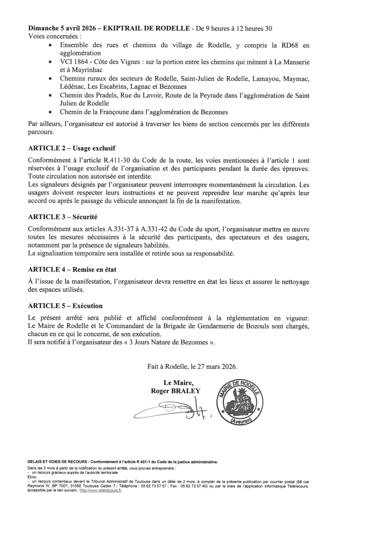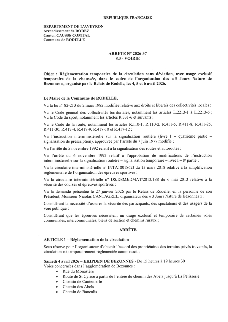 Un usage exclusif temporaire sur certaines voies et chemins communaux est accordé à la manifestation « 3 Jours Nature de Bezonnes ».