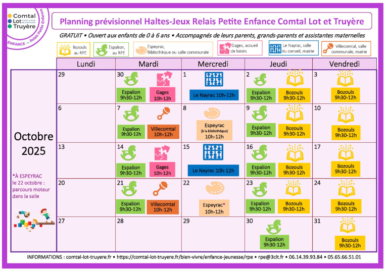 Planning du mois d’octobre des haltes-jeux pour les enfants jusqu’à 6 ans, organisées par le Relais Petite Enfance de la Communauté de Communes Comtal, Lot et Truyère .