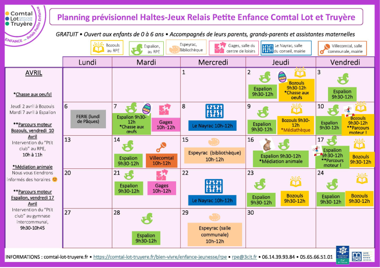 Planning du mois d’avril des haltes-jeux pour les enfants jusqu’à 6 ans, organisées par le Relais Petite Enfance de la Communauté de Communes Comtal, Lot et Truyère .